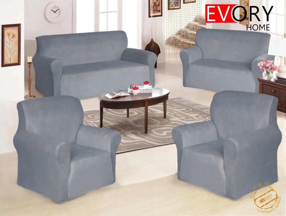 طقم غطاء كنب ٤ قطع قطيفة ساده ناعم و مريح - رصاصي فاتح